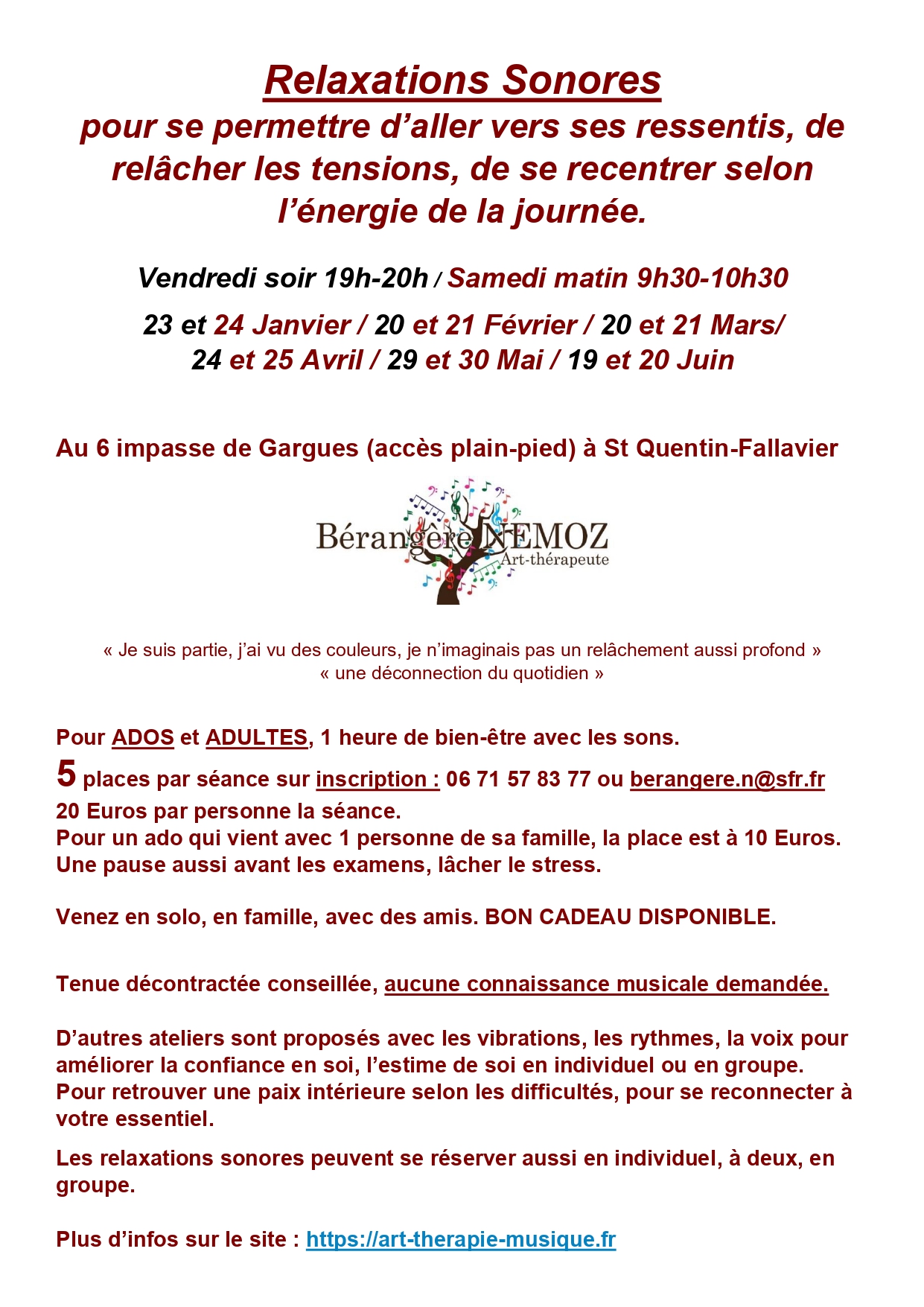 « En se concentrant sur sa respiration, sur les différents sons des instruments et la voix de Bérangère, le mental perd peu à peu sa place et laisse le corps se détendre : une parenthèse bénéfique pour soi. »